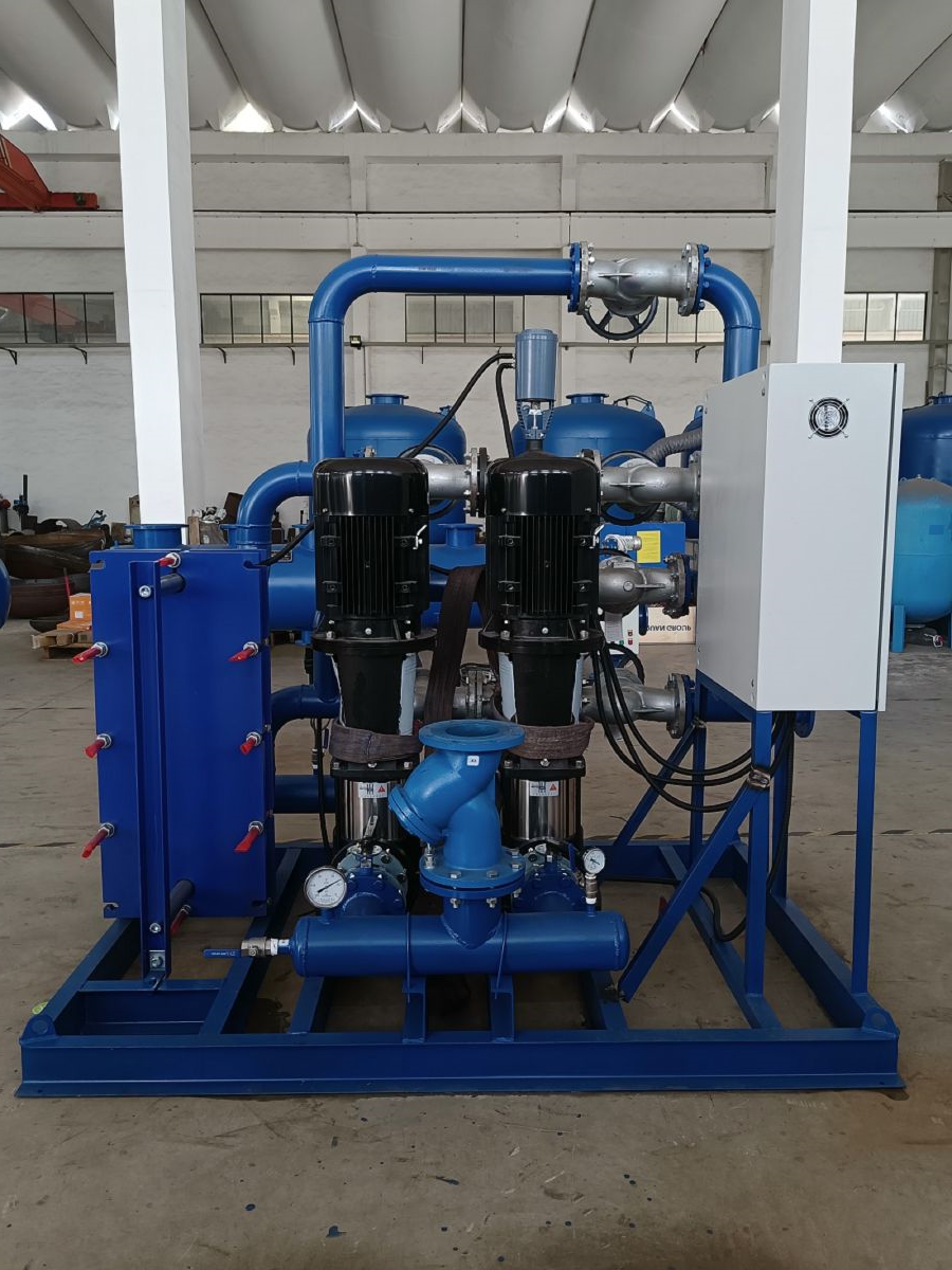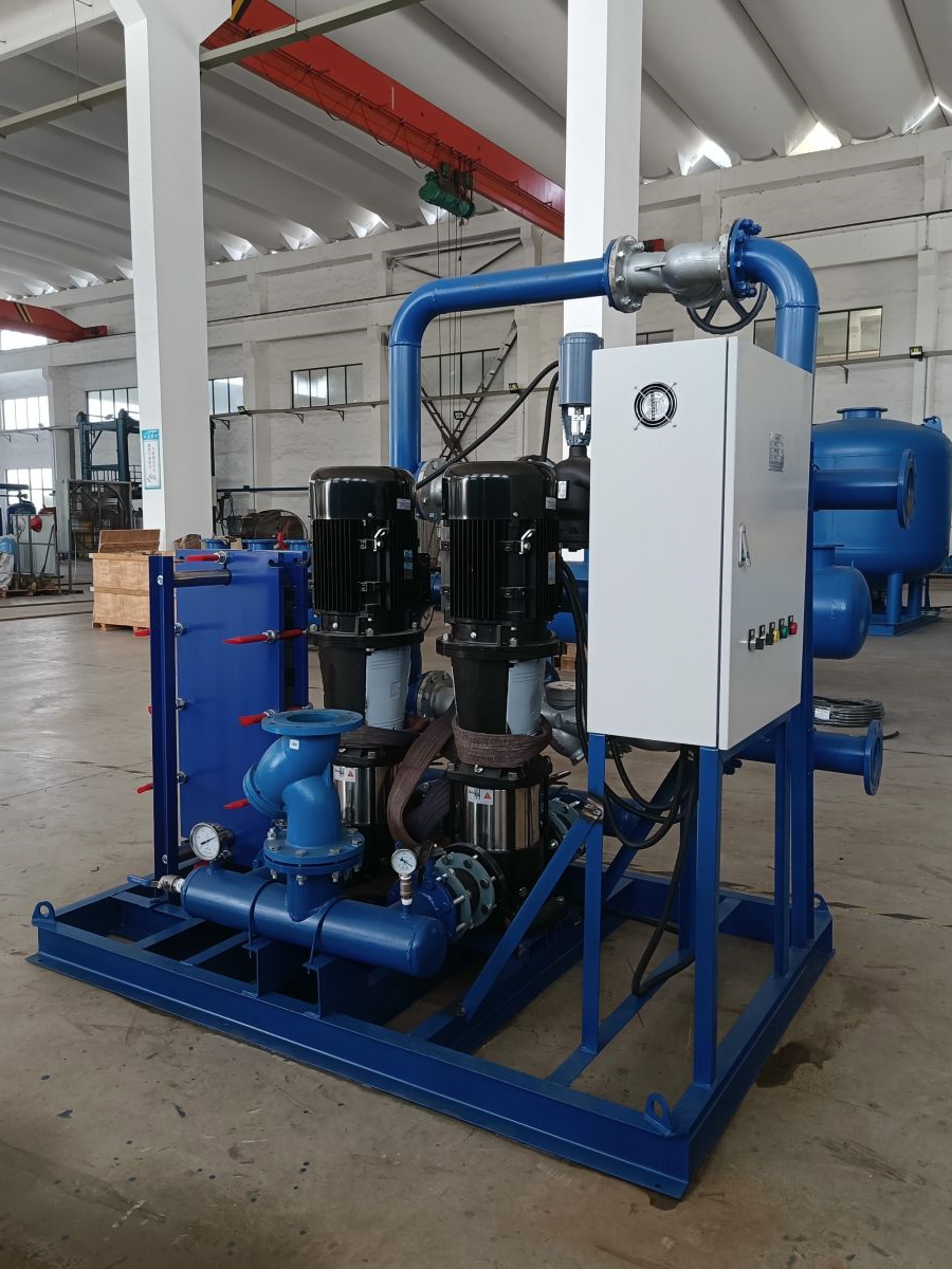 板式换热机组,为换热机组的一种型号,其特点是采用板式换热器,在相同压力损失情况下,其传热系数比管式换热器高3-5倍,占地面积为管式换热器的三分之一,热回收率高。设备由板式换热器、智能温控装置、智能电控装置、循环泵、补水泵、稳压膨胀水箱、补(凝)水箱、过滤器、阀门、仪表、传感器、配管底座等组成。