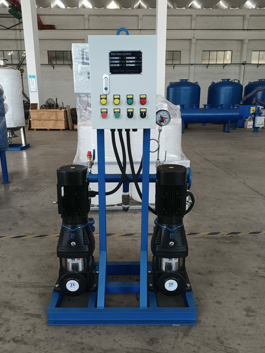 定压补水机组由囊式压力罐、水泵、控制箱、底架、压力感应装置、管道阀门等组合而成,是一种兼有升压、调节、储水、供水等多种功能的常用供水设备。定压补水机组利用气压罐的可调节能力,可自动调节用户水量的变化,当用水量减少或不用水时,可较长时间不启动水泵,达到节能目的。与水塔、高位水箱相比可节省投资约40%-60%。该设备结构紧凑,与其他传统的供水装置相比减少了占地面积,节省了土地资源。本设备全自动运行,无需专人管理,工作可靠。