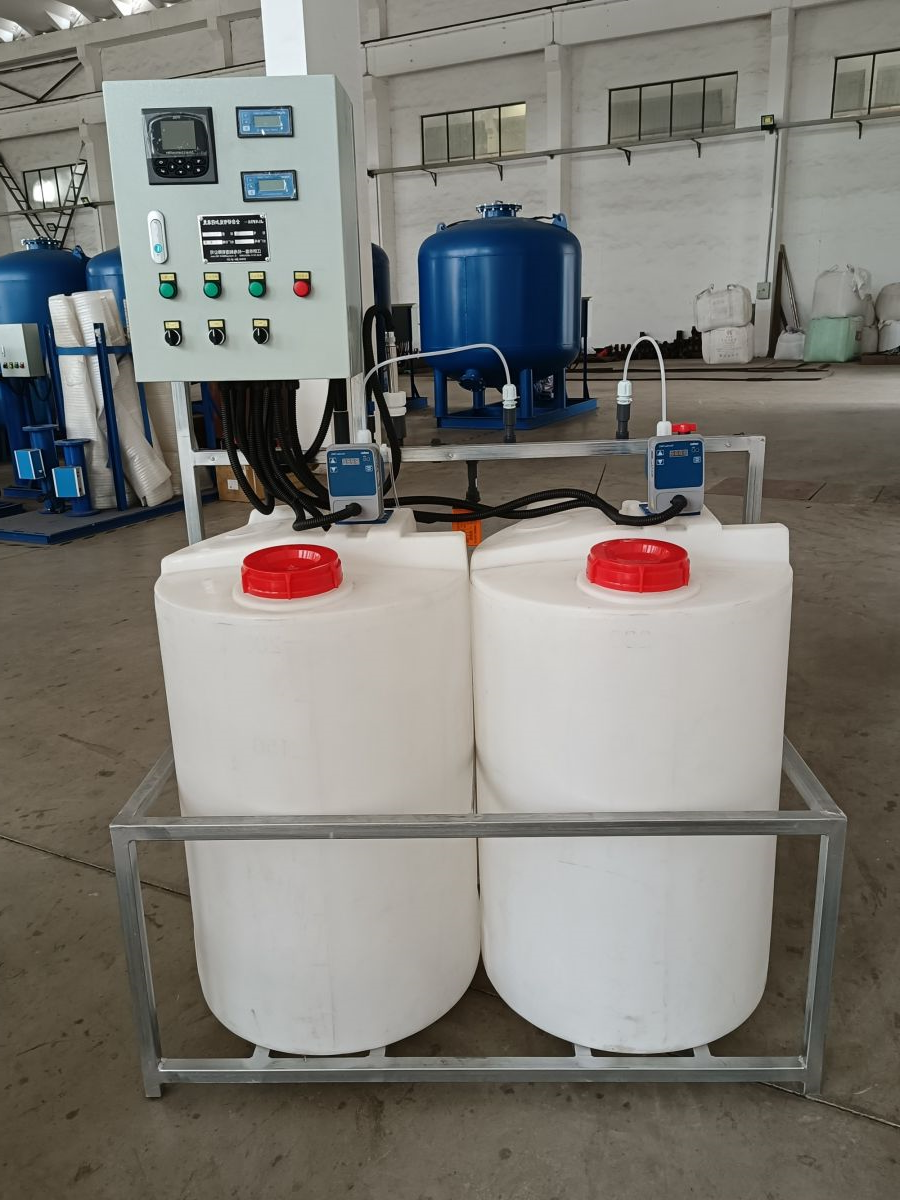 全自动加药装置采用时间程序控制,此控制方式无需仪表的支持,首先根据系统的运转需要设定自动加药的周期、加药量、加药时间和加药频率。在以后的系统运转过程中,到加药周期,计量泵自动打开加药,加到规定的时间计量泵关闭;到排污周期,计量泵停止加药,排到规定的时间后,计量泵继续开启,补充排污损失掉的药剂,把系统的含药量维持在正常的水平、加到规定的时间计量泵关闭。