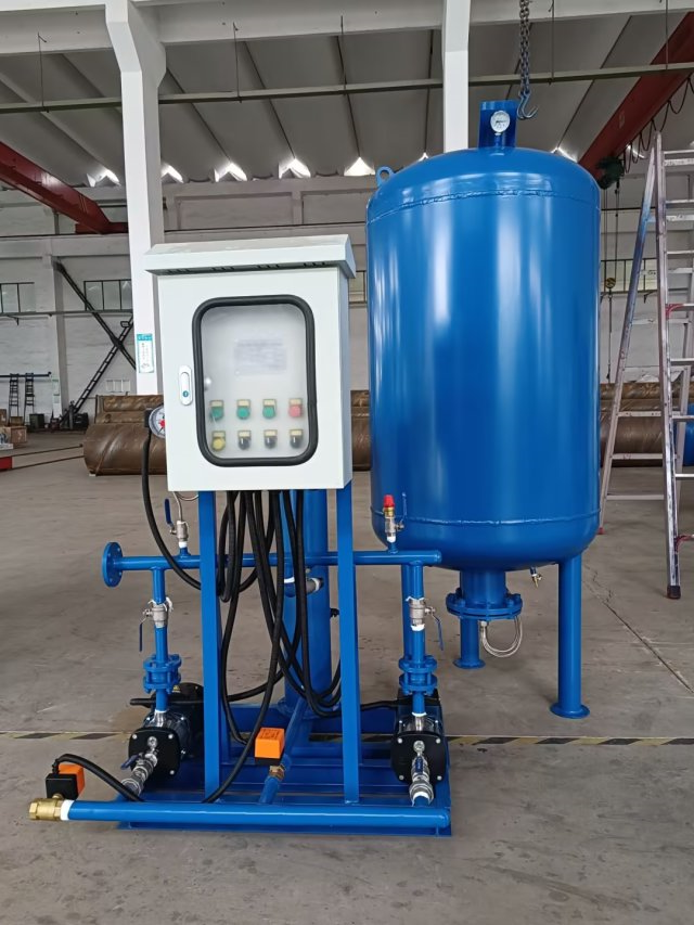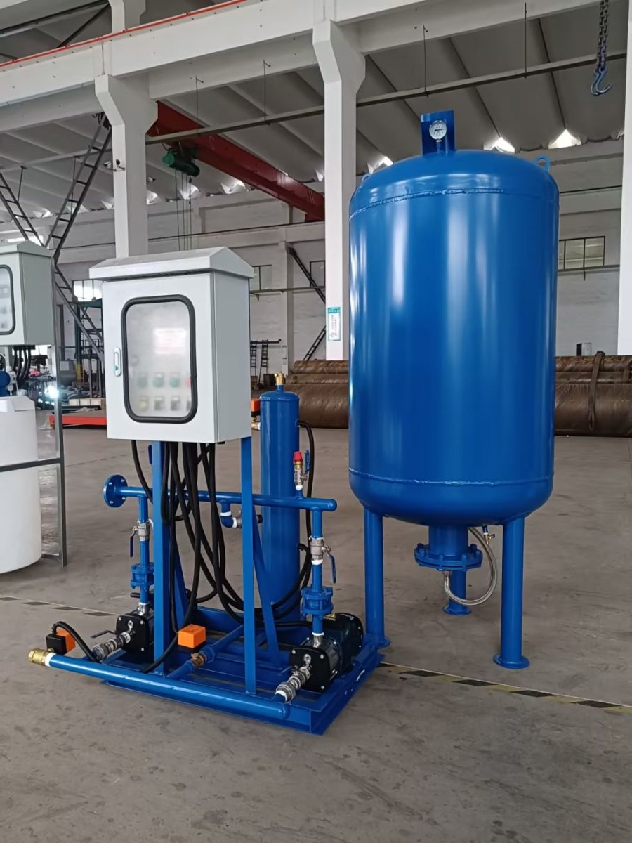 定压补水机组由囊式压力罐、水泵、控制箱、底架、压力感应装置、管道阀门等组合而成,是一种兼有升压、调节、储水、供水等多种功能的常用供水设备。定压补水机组利用气压罐的可调节能力,可自动调节用户水量的变化,当用水量减少或不用水时,可较长时间不启动水泵,达到节能目的。与水塔、高位水箱相比可节省投资约40%-60%。该设备结构紧凑,与其他传统的供水装置相比减少了占地面积,节省了土地资源。本设备全自动运行,无需专人管理,工作可靠。