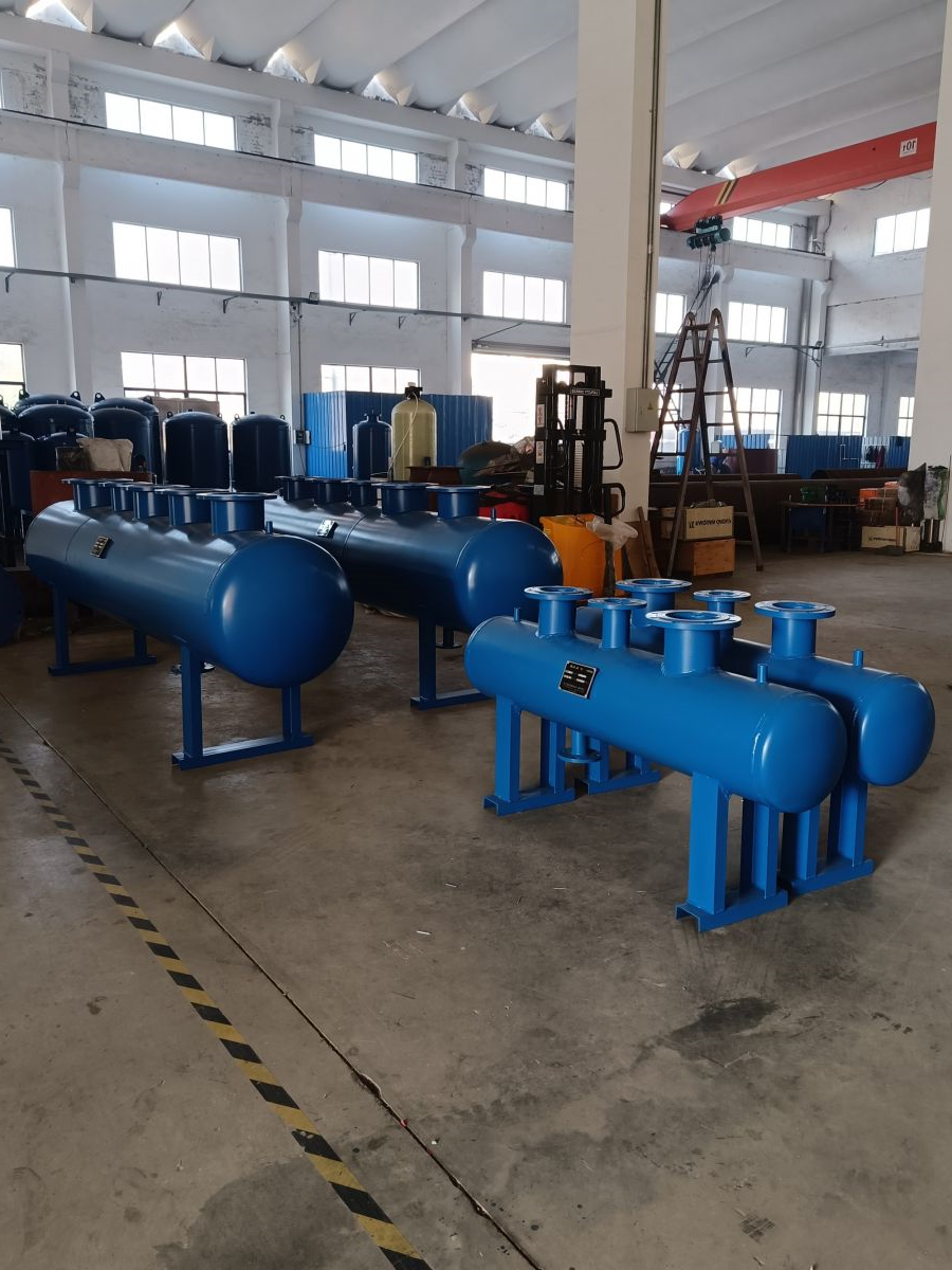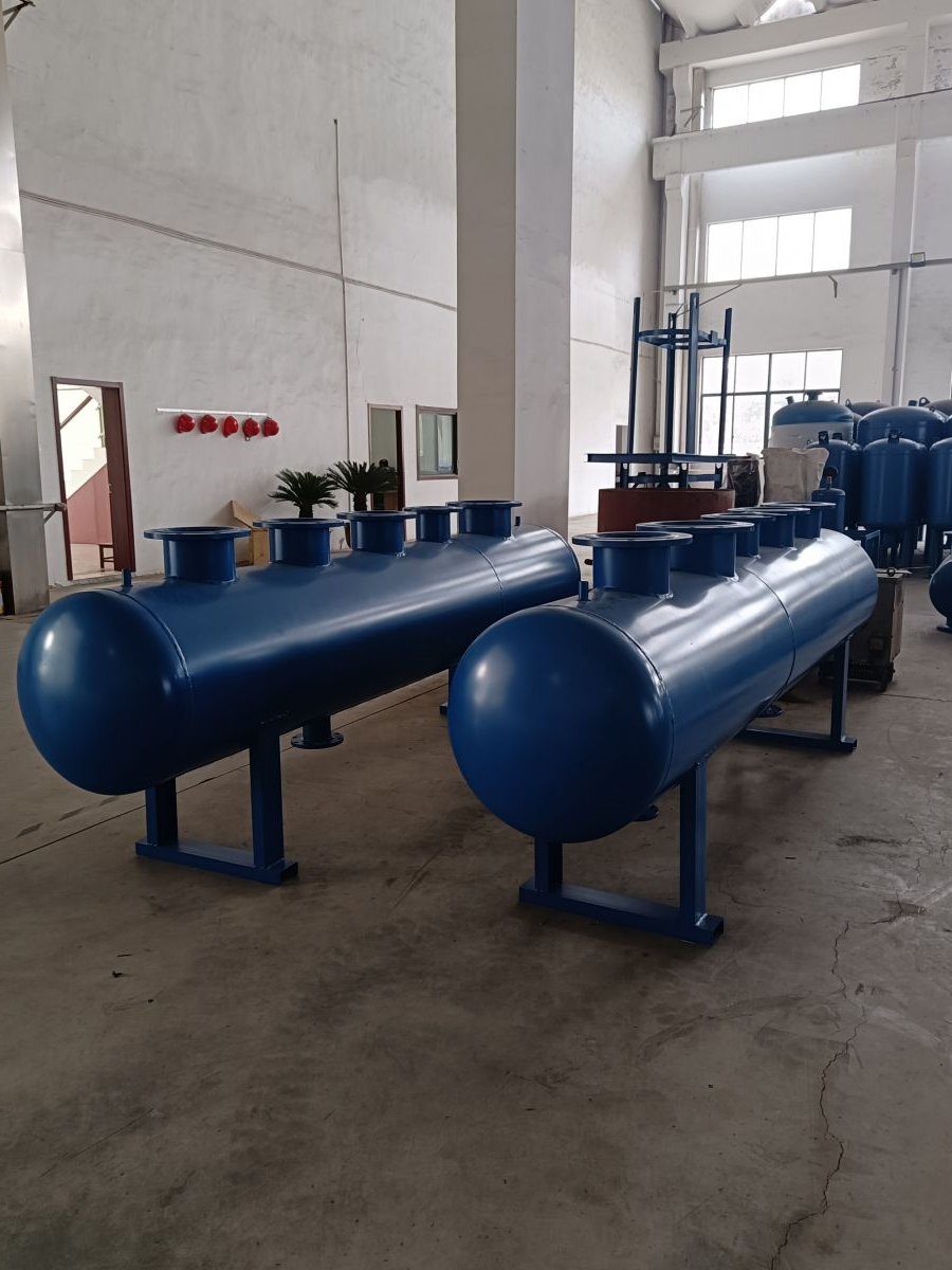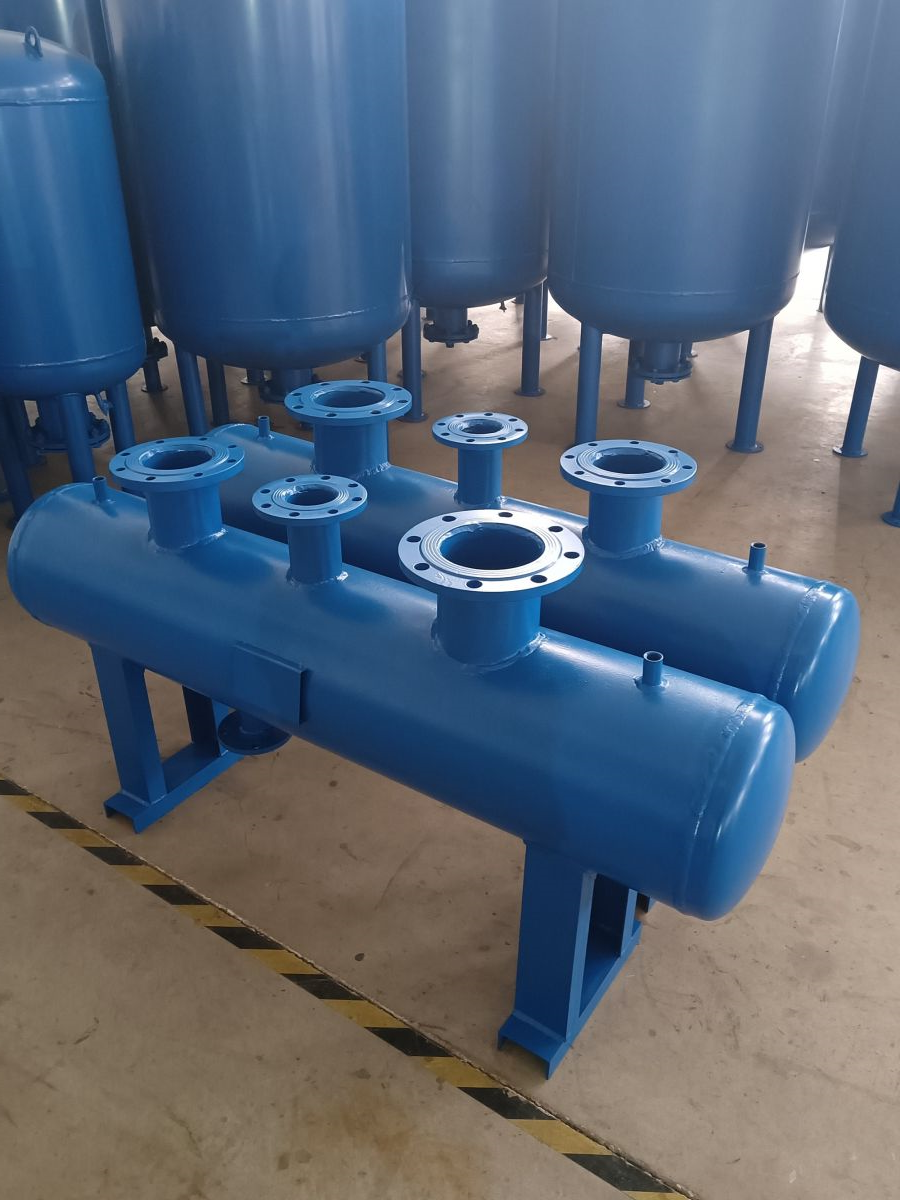 分水器是将一路进水通过一个容器分为几路输出的设备,而集水器则是将多路进水通过一个容器一路输出的设备。其管理若干的支路管道,分别包括回水支路和供水支路,用碳钢或不锈钢板制作,属于压力容器类专业制造,其需要安装压力表温度计。它一方面将主干管的水按需要进行流量分配,保证各区域分支环路的流量满足负荷需要,同时还要将各分支回路的水流汇集,并且输入回水主干管中,实现循环运行。其回水再利用,可达到更节能的效果,可以同时满足供热与制冷的需要。