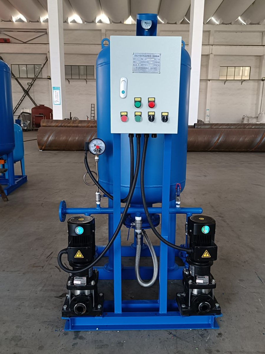 定压补水机组由囊式压力罐、水泵、控制箱、底架、压力感应装置、管道阀门等组合而成,是一种兼有升压、调节、储水、供水等多种功能的常用供水设备。定压补水机组利用气压罐的可调节能力,可自动调节用户水量的变化,当用水量减少或不用水时,可较长时间不启动水泵,达到节能目的。与水塔、高位水箱相比可节省投资约40%-60%。该设备结构紧凑,与其他传统的供水装置相比减少了占地面积,节省了土地资源。本设备全自动运行,无需专人管理,工作可靠。